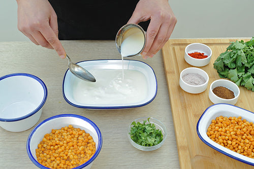 Add salt, half the roasted cumin powder, and half of the chopped coriander to the yogurt.