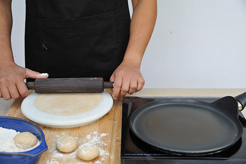 Divide the dough into small to medium balls. Roll the balls in the palms of your hands. Dust the balls lightly with flour and roll into a flat round circle using a roti board and rolling pin.