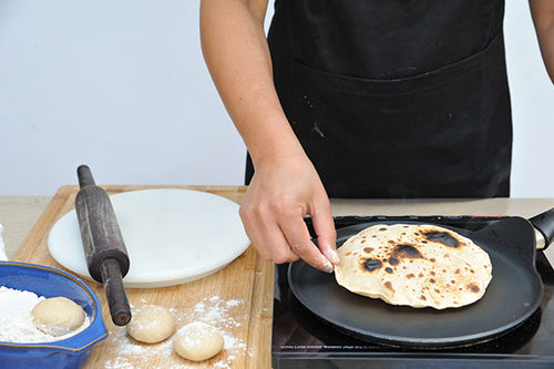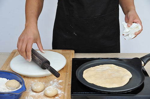 Heat a non-stick pan on medium heat until it is quite hot. Place the rolled roti onto the pan and turn up the heat slightly.
