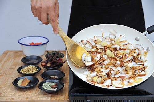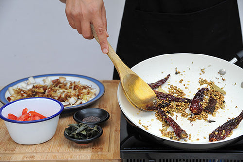Now add another tbsp of oil to the pan to fry all the whole spices (except mustard seeds) on low heat for around 3-4 minutes, until they release aroma.