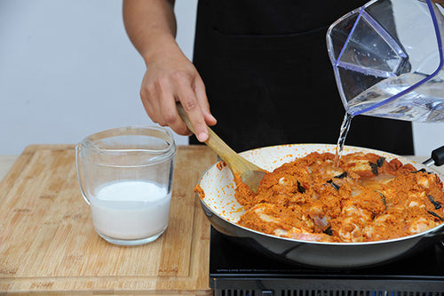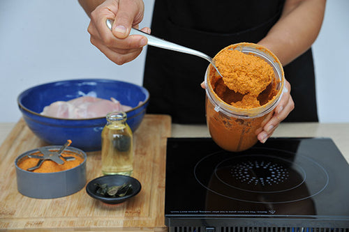 Once these have cooled, put them in a blender along with the onions, coconut, garlic, and ginger fried before. Keep adding water in small quantities as you blend and make a smooth paste.