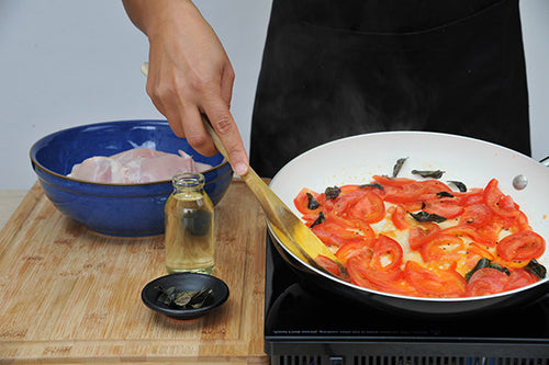 Heat the remaining 1 tbsp oil in the pan on medium heat. Add the mustard seeds and wait for them to splutter. Then add around 15 curry leaves followed by the tomatoes. Fry well until oil appears on the surface.