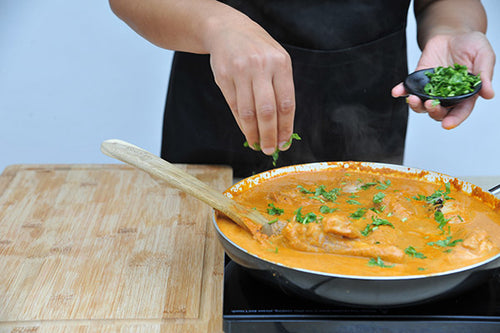 Add the coconut milk now. Cook the gravy until it thickens to your taste. Serve hot with steamed or coconut rice and garnish with coriander.
