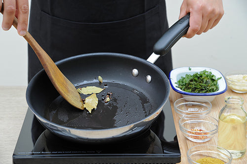 Heat the oil in a heavy-bottomed saucepan. Add whole spices – bay leaves, cloves, cinnamon sticks, black peppercorns, and black cardamoms and allow them to sizzle for about 30 seconds. Add cumin seeds.