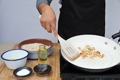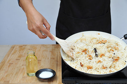 Cook covered on low heat until the rice is cooked through and dry any excess liquid for 1-2 minutes in the end. Serve garnished with roasted cashew nuts.
