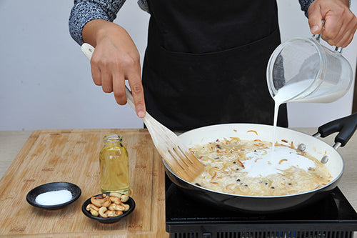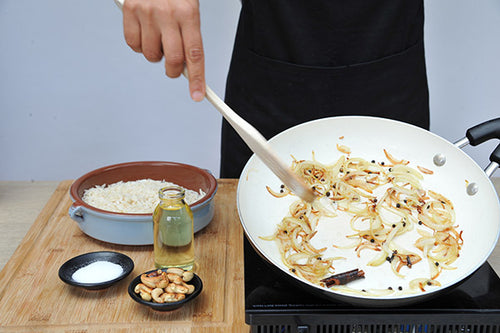 Heat the oil in a wide bottom pan. Add the whole spices, allow them to sizzle for 30-40 seconds, and then add the onion. Sauté until soft and caramelizing on the edges.