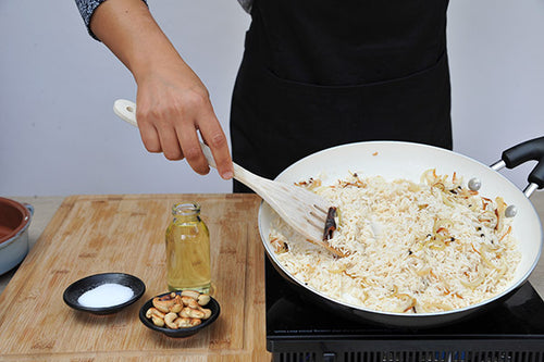 Add the coconut milk and water. Season with salt to taste. Bring to a boil and wait for the liquid to reduce a little before you cover the rice.