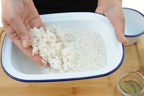 To make sure you get fluffy rice, wash it in at least 3-4 changes of cold water, then leave to soak for about 30 minutes in fresh cold water.