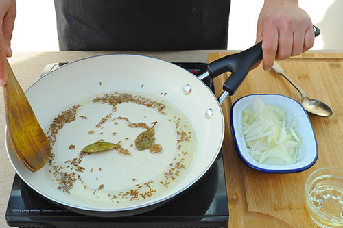 Heat oil in a wide bottom pan. Then add bay leaves and cumin seeds. Allow them to sizzle for about 20 seconds.