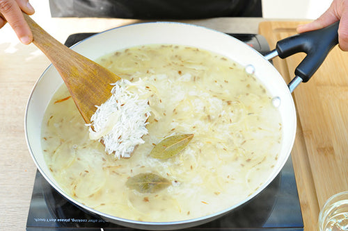 Mix the onion, spices, and rice all together. Add water to cover the rice. Bring water to boil and keep on medium to high flame for 5-10 minutes. Once the water starts going down, cover the pan and let it simmer.