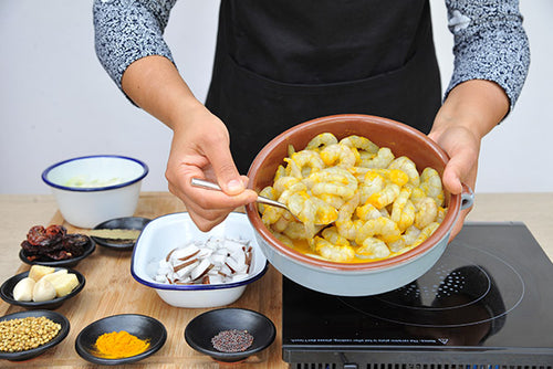In a bowl add the prawns, sprinkle over turmeric powder and salt. Mix and set aside for 15-20 minutes while you get the curry ready.