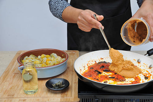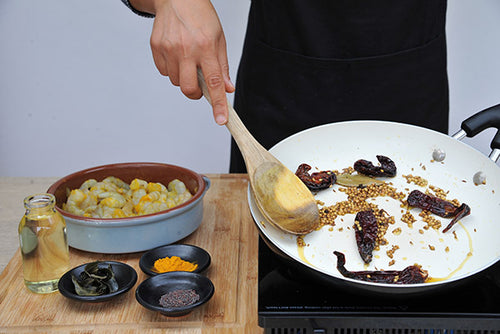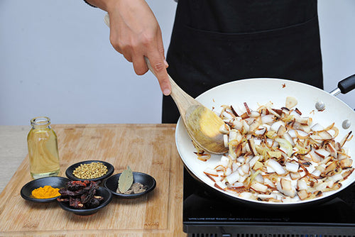 Now add a little oil to the pan to fry all the whole spices (except mustard seeds) on a slow flame for around 3-4 minutes until they release aroma. Once these have cooled, put them in a blender along with the onion, coconut, garlic, and ginger fried before. You will need to add water at this stage to make a paste. Keep adding water in small quantities to blend.