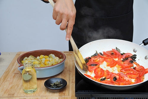 Heat the remaining oil in the pan on low to medium heat. Add the mustard seeds and wait for them to splutter in the oil. Then add a few curry leaves followed by the tomato. Fry well until oil appears on the surface.