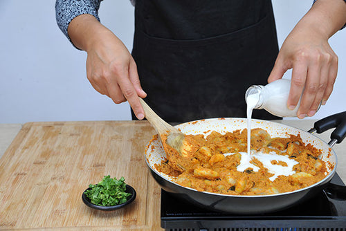 While the paste is frying, add the marinated prawns and cook for 2-3 minutes. Now add water, coconut milk, tamarind paste and let the gravy come to a boil. Cook prawns over low heat for 6-7 minutes with the lid on, stirring halfway through. Garnish with chopped coriander leaves and serve hot with steamed rice.