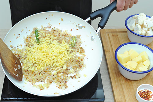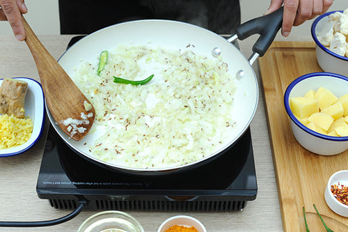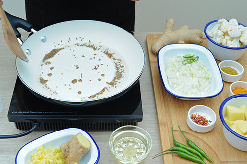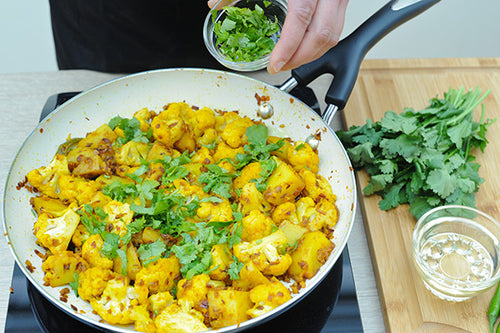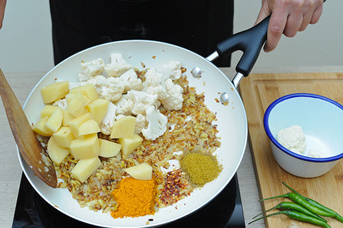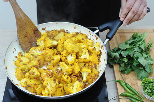 Fry the cauliflower and potatoes on medium to high heat first to brown them slightly. Then cover and simmer for 10 minutes or until the vegetables are cooked.
