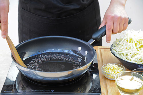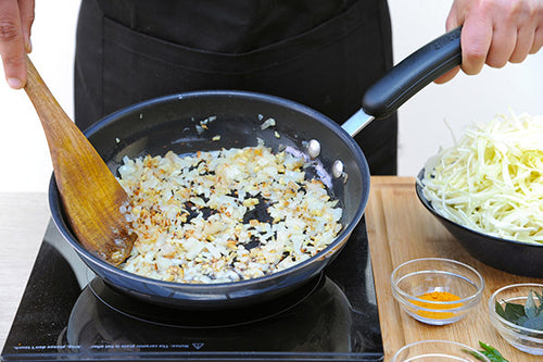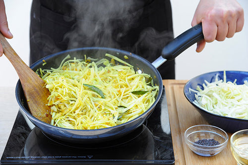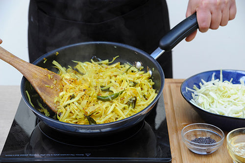 Remove the lid and if the cabbage is nearly cooked, fry for a couple of minutes to dry any extra moisture in the pan.