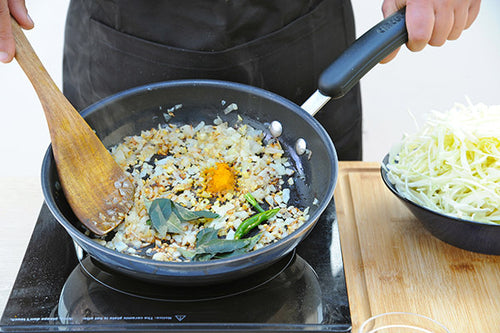 Thoran is a simple stir fry dish from Kerala in Southern India, cooked using finely shredded cabbage or any other seasonal vegetables tossed in an assortment of a few simple spices and garnished with fresh or desiccated coconut.