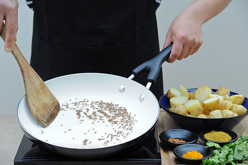 Heat the oil in a pan on medium heat and add cumin seeds. Fry them for 10-15 seconds until they start to sizzle and change colour slightly.