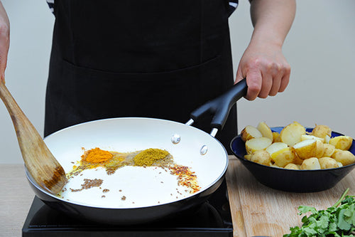 Fry the potatoes coated in spices on medium heat stirring occasionally until they turn crisp and brown. Cover with a lid and leave for 7-10 minutes on low heat or until they are cooked.