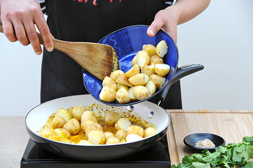 Now add the potatoes. The colour of the spices will deepen and they will start coating the potatoes.