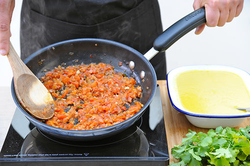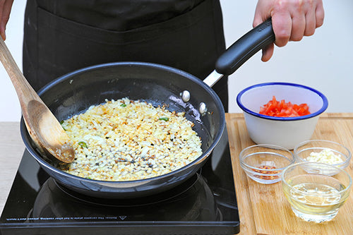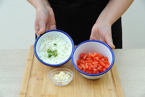 While the lentils are cooking prepare the onion, tomatoes and garlic.
