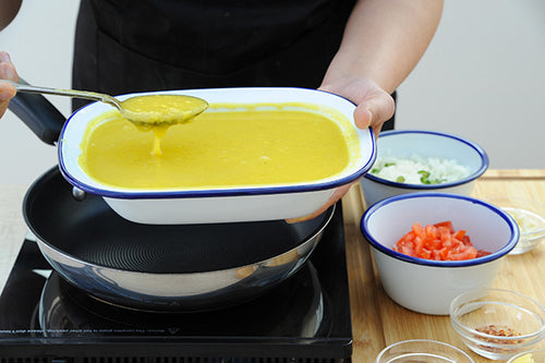 For the ‘Tadka’ or tempering, take a small pan and heat oil on medium heat. Add cumin seeds to oil and when they start to turn brown, add green chili and onions and cook until light golden.