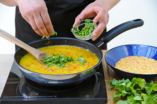 Add this tempering to the dal, mix well to blend the flavours and garnish with fresh coriander.