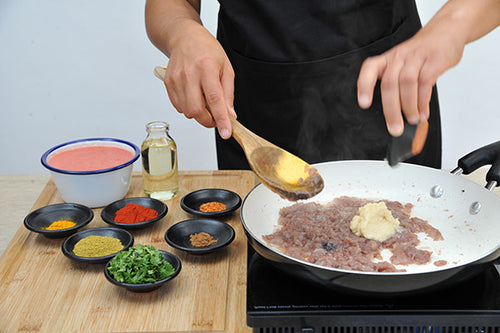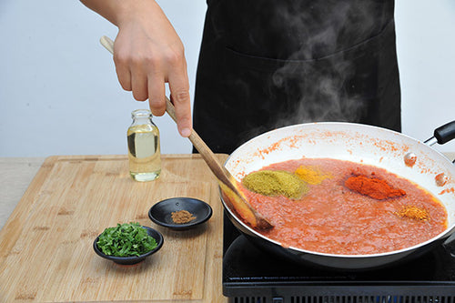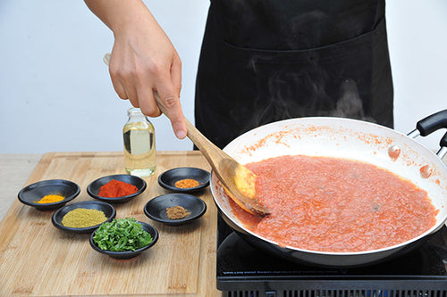 Add tomato puree, salt, and mix well. Continue to cook on medium heat for a few minutes.