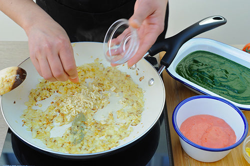 Add pureed spinach, bring to a boil, and then simmer for 10 mins to get the right consistency. Check for seasoning and add a little water if required at this stage.