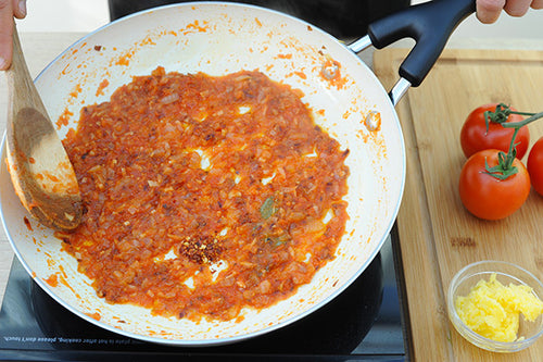 Add pureed tomatoes and fry until the oil leaves the sides. Then add red chilli powder and a little salt.