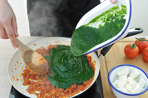 Boil all the spinach in ¾ cup of water along with whole green chillies. Allow the spinach to cool, blend into a smooth paste, and set aside.