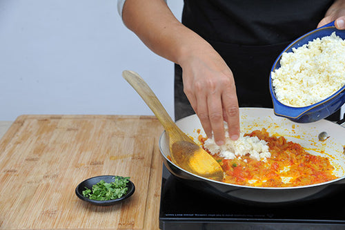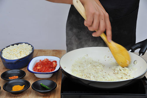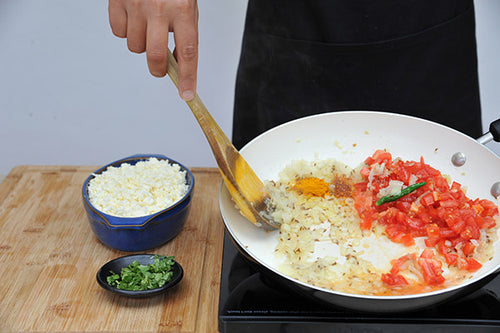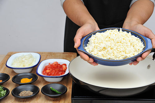 Crumble the paneer (fresh unsalted cheese) using your hands and set aside. Prepare the onions, tomatoes, and green chilies. Keep aside along with the spices.