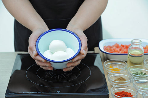 Heat a saucepan full of water on medium heat and boil the eggs for 10 minutes. Peel and set aside.