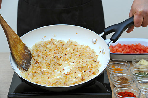 Now heat oil in a wide bottom pan and add the finely chopped onions. Keep frying on medium heat until they turn golden brown.