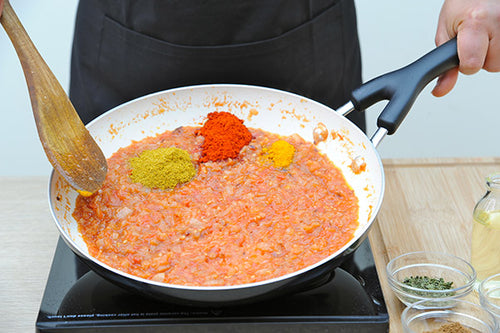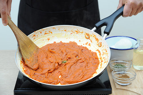 Then add the ginger garlic paste and fry for a few minutes. Add tomatoes to the pan now and sprinkle a little salt over them. This will help dry up the water quickly. Once the oil starts separating, add coriander & cumin powder, turmeric and Kashmiri chilli at this stage. Once the masala starts leaving oil on the sides take it off the heat.
