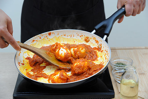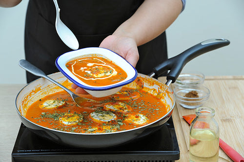 Then add some boiled water to the pan and bring to a boil. Slit the eggs into halves now and add to the pan so that they soak up the flavor of the curry. Add cream to the curry and garnish with garam masala, chopped coriander and dried fenugreek leaves.